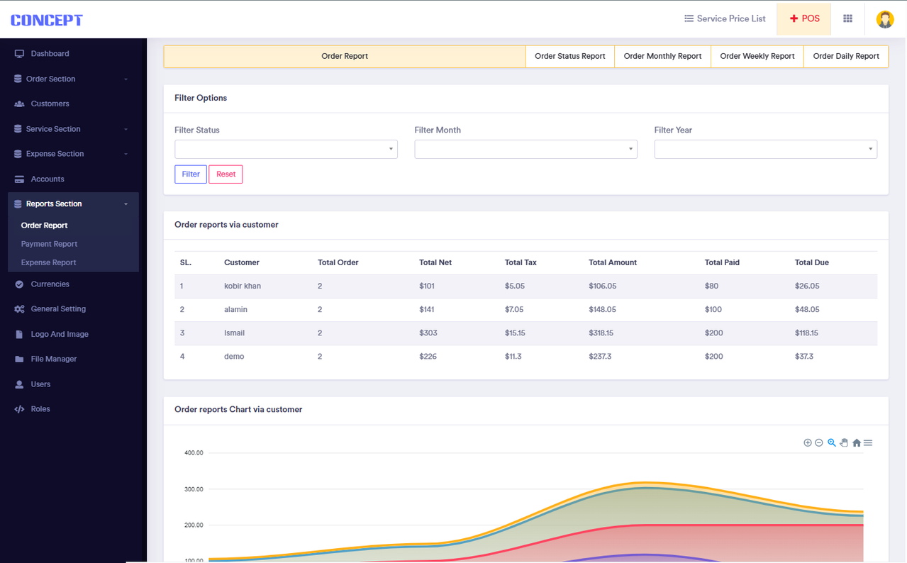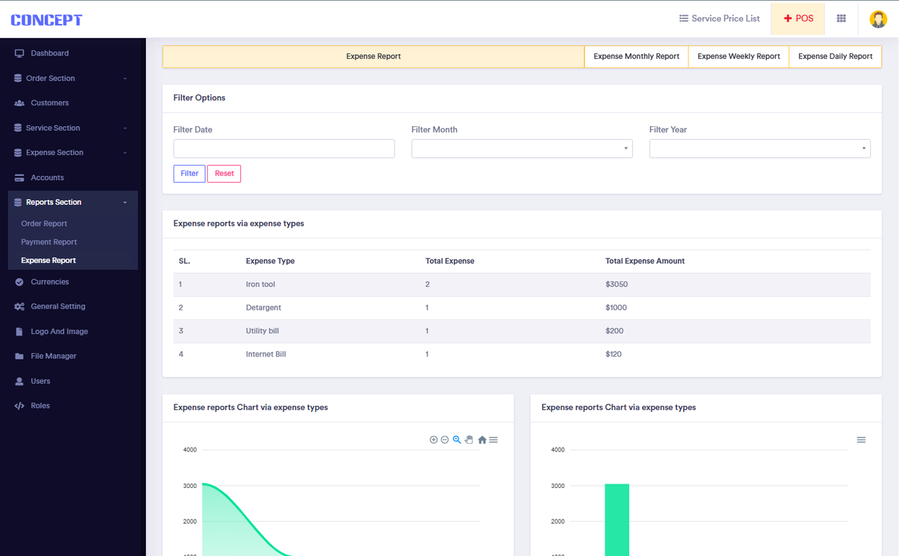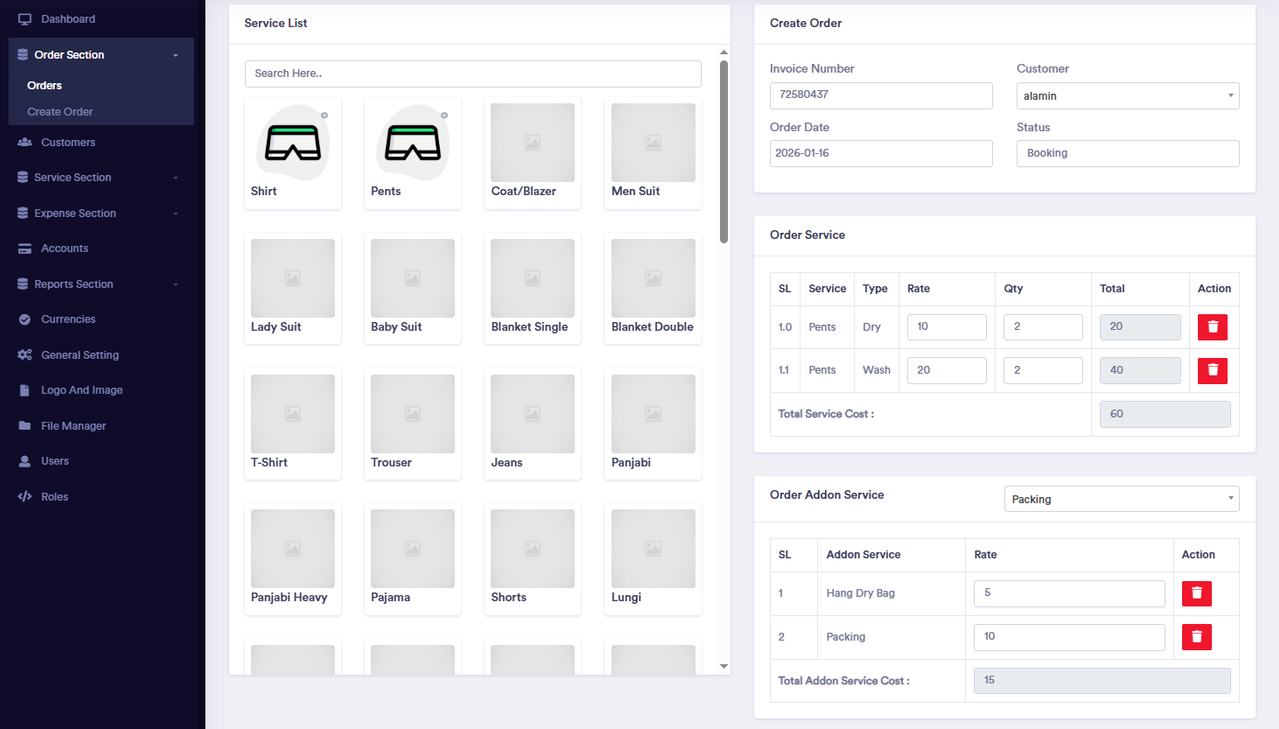 Laundry management system. dry, clean, wash, iron and unlimited type services managment. Expense with accounting management. Comprehensive Reports, Payment collection and due managment, customer and order management and more..