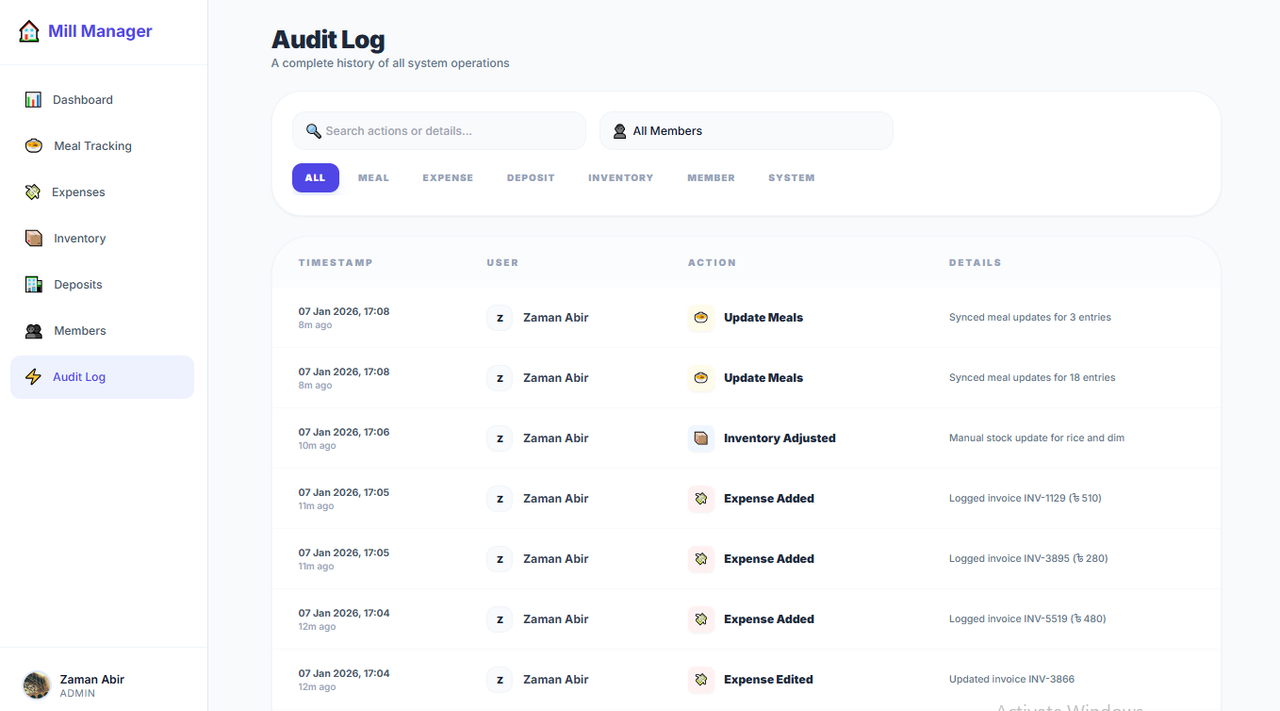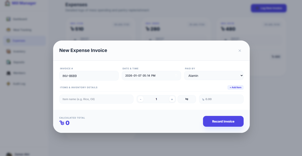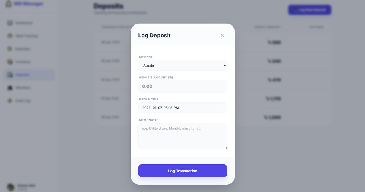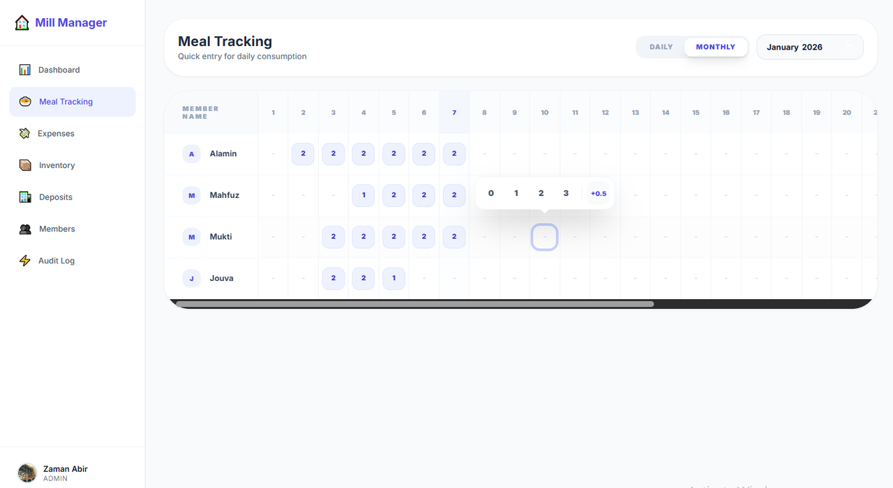 Bachelor Meal Management software application. Meal tracking, Expense managment, Deposit log transactions, Inventory tracking, Members managment, Monthly and daily reports. Due and overdue system